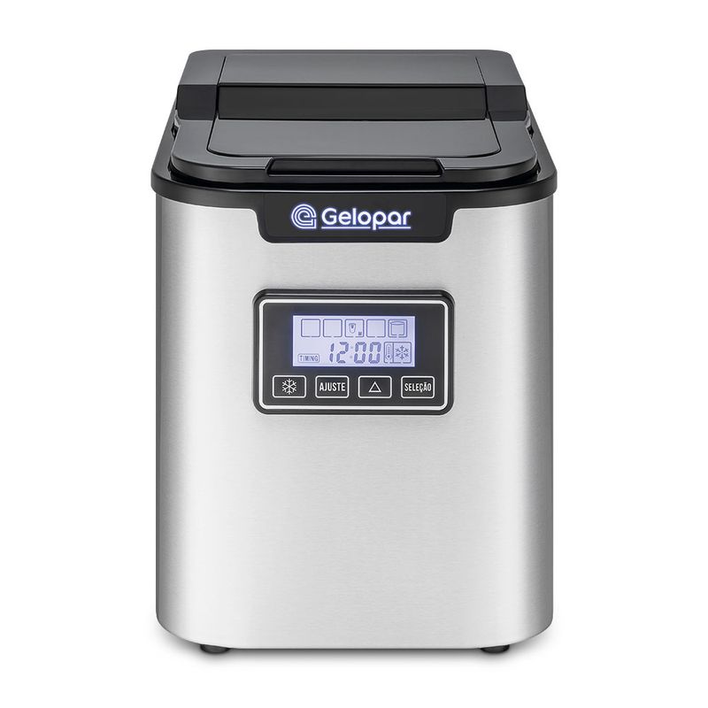 Máquina de GeloPortátilDisplay digital multifunções:Inicialização de funcionamentoProgramação de horário de fabricaçãoSeleção do tamanho do cubo de geloAvisos de funcionamento no displayRevestimento externo: Aço inoxBandeja coletora e pá em polipropilenoSistema autolimpanteDreno para escoamento de águaTampa sujeita a condensação da umidade do arReservatório de água com capacidade para 2,2 litrosBaixo ruídoAté 12kg de gelo/diaEquipamento(s) certificado(s) conforme Portaria Inmetro nº 148/2022Produto destinado para uso comercial** Cores de acabamento e materiais sujeitos a variação de acordo com o lote de produção e/ou entre os materiais que compõem o produto (ex.: chapa, plástico,madeiras e etc.)