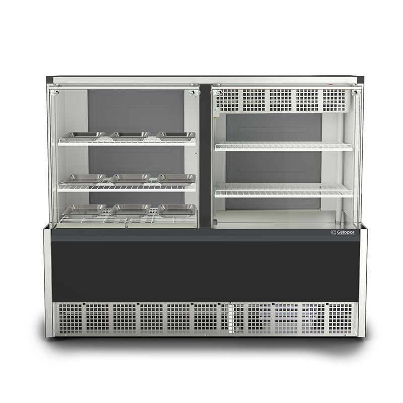 Vitrine Quente/Fria EvaporadorLinha AuroraTemperatura: Lado refrigerado (direito) de 0 a +10C | Lado aquecido (esquerdo) +30 a +65CLado aquecido (esquerdo) +30 a +65CGabinete: Monobloco em aço pré-pintado pretoPrateleiras aramadasLado refrigerado: 2 níveis, aramadasLado aquecido: 2 níveis, aramadas | Lado Refrigerado: 2 níveis, aramadasVidros baixo emissivos na parte refrigeradaVidros temperados sujeitos a condensação da umidade do arBandejas GN 1/3 em aço inox (9 unidades)Equipamento(s) certificado(s) conforme Portaria Inmetro nº 148/2022Produto destinado para uso comercial* Imagens meramente ilustrativas. Imagens e informações sujeitas a alterações sem aviso prévio. ** Cores de acabamento e materiais sujeitos a variação de acordo com o lote de produção e/ou entre os materiais que compõem o produto (ex.: chapa, plástico,madeiras e etc.)