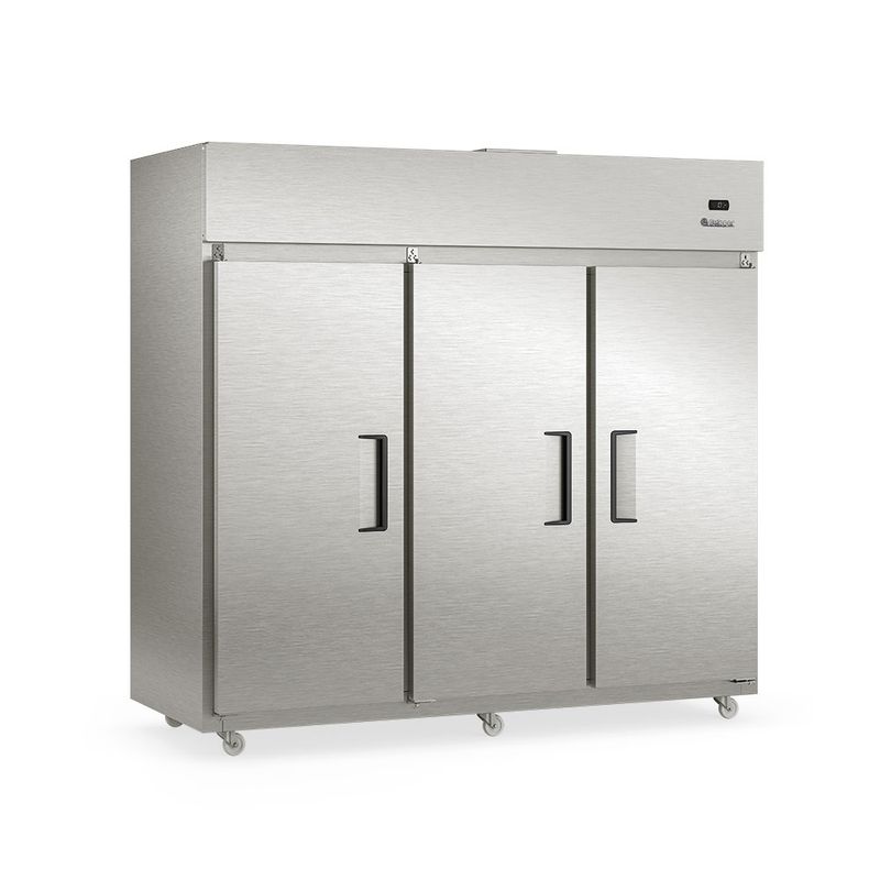 Refrigerador Comercial 3 PortasTemperatura: 0 a +7CAço Inox 304Aço Revestido com Película Tipo InoxFechamento automático e trava de abastecimentoPortas verticais com sistema de travaResistência no quadro de portas Prateleiras aramadas revestidas em polietileno ou alternativamente em Aço Inox4 níveis, aramadas, reguláveis em arame trefilado com pintura eletrostática cor alumínio4 níveis reguláveis + Estrado PVCConstrução do Gabinete: MonoblocoParte Frontal sem resistência no quadro de portas, podendo ocorrer condensação da umidade do arEstrado em PVC na BaseEquipamento(s) certificado(s) conforme Portaria Inmetro nº 148/2022Produto destinado para uso comercial* Imagens meramente ilustrativas. Imagens e informações sujeitas a alterações sem aviso prévio. ** Cores de acabamento e materiais sujeitos a variação de acordo com o lote de produção e/ou entre os materiais que compõem o produto (ex.: chapa, plástico,madeiras e etc.)