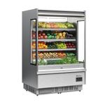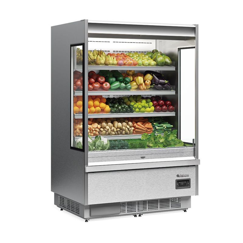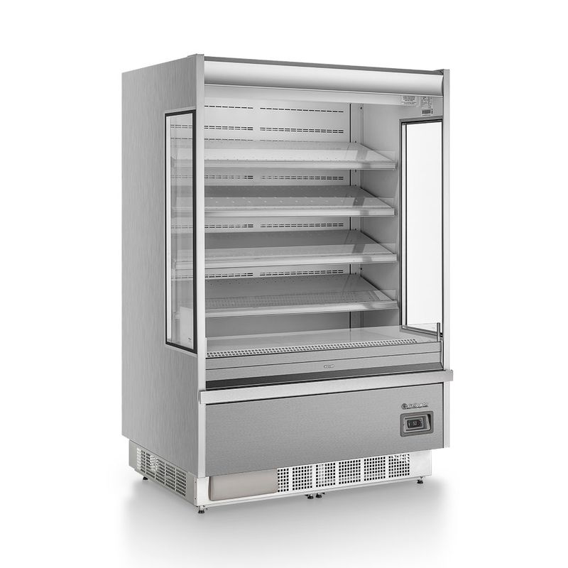 Refrigerador Vertical AbertoBebidas, Frios e Laticínios ou HortifrutiTemperatura: Bebidas: +3 a +8C | Hortifruti: +5 a +10CTemperatura: Hortifruti: +5 a +10Caço revestido Tipo InoxCabeceiras em aço com visor em vidro duplo temperado com aquecimento perimetralPrateleiras com porta etiquetas e anteparo em acrílico4 níveis, em chapa, reguláveis, inclináveis + base interna removível para facilitar a limpeza4 níveis em chapa,reguláveis e inclináveisEquipamento desenvolvido para operar em ambientes com, no máximo, 25C de temperatura e 60% de U.R. (umidade relativa do ar)*Cortina noturna em PVC micro perfuradoGaveta para coleta de água do degeloVidros sujeitos a condensação da umidade do arEquipamento(s) certificado(s) conforme Portaria Inmetro nº 148/2022Produto destinado para uso comercial* Imagens meramente ilustrativas. Imagens e informações sujeitas a alterações sem aviso prévio. ** Cores de acabamento e materiais sujeitos a variação de acordo com o lote de produção e/ou entre os materiais que compõem o produto (ex.: chapa, plástico,madeiras e etc.)** Consumo medido com cortina levantada (12h) + baixada (12h).
