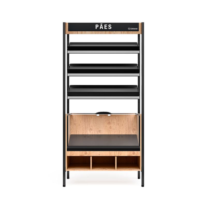 Estante para PãesAtendimento ou Auto AtendimentoBase em aço pré-pintado com ajuste de alturaEstrutura em tubo de metalon com pintura epóxiTampas deslizantes, com abertura para abastecimento e atendimentoPrateleiras em aço-pré pintado3 níveis em aço pré-pintado preto, com anteparo e porta etiquetasGaveta coletora de migalhas, removível para limpezaCaixa para pães em MDF, com visor e tampas em vidroGaveta coletora de migalhas, removível para limpezaNichos inferiores para embalagensProduto pré-montado, com encaixe rápidoProduto pode ser utilizado para auto-atendimento, com perfeito alinhamento com a Linha AuroraEquipamento(s) certificado(s) conforme Portaria Inmetro nº 148/2022Produto destinado para uso comercial** Cores de acabamento e materiais sujeitos a variação de acordo com o lote de produção e/ou entre os materiais que compõem o produto (ex.: chapa, plástico,madeiras e etc.)